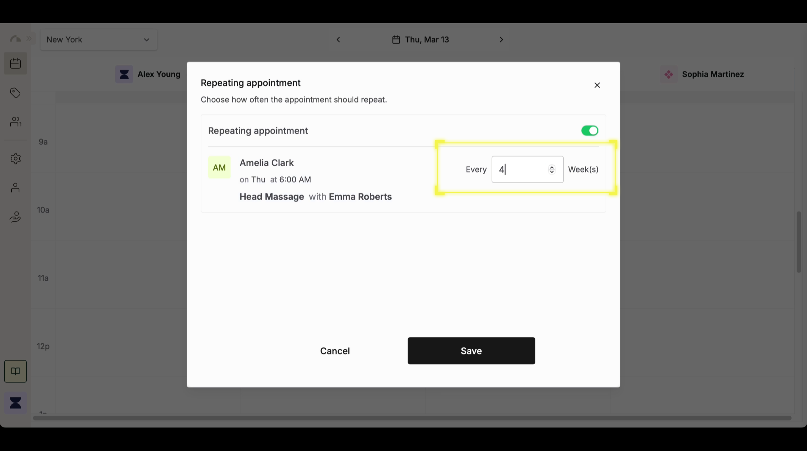 Set the weekly recurrence frequency based on how often the client needs the service. You can select every 1 week for weekly appointments, every 2 weeks for biweekly sessions, or customize the recurrence interval as needed. Choosing the correct frequency ensures that appointments are scheduled consistently without overbooking.