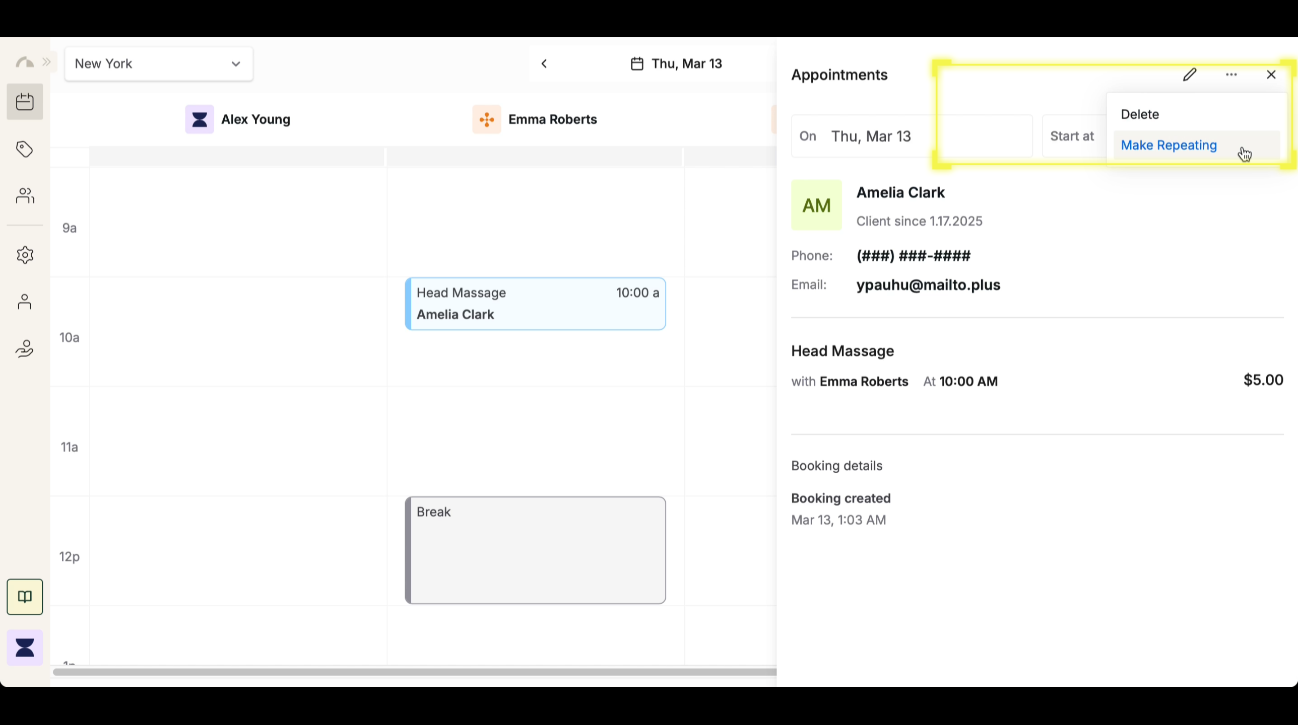 Click the 3-dot icon in the appointment settings and select “Make Repeating” to enable recurring bookings. This allows the system to generate future appointments based on a set interval, ensuring availability for repeat clients.