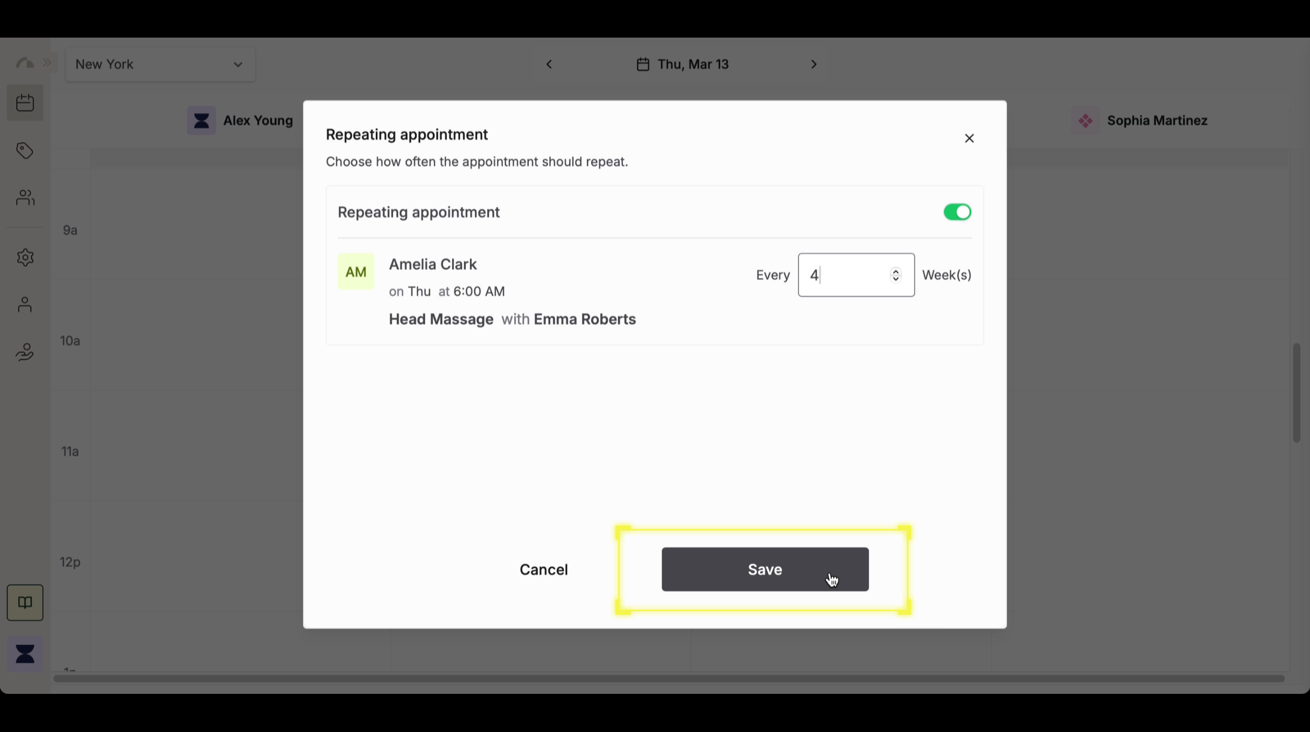 Review the appointment details, including the client, service, assigned staff, and frequency settings. Once everything is correct, click “Save” to finalize the recurring booking. The system will now automatically generate future appointments according to the selected frequency.