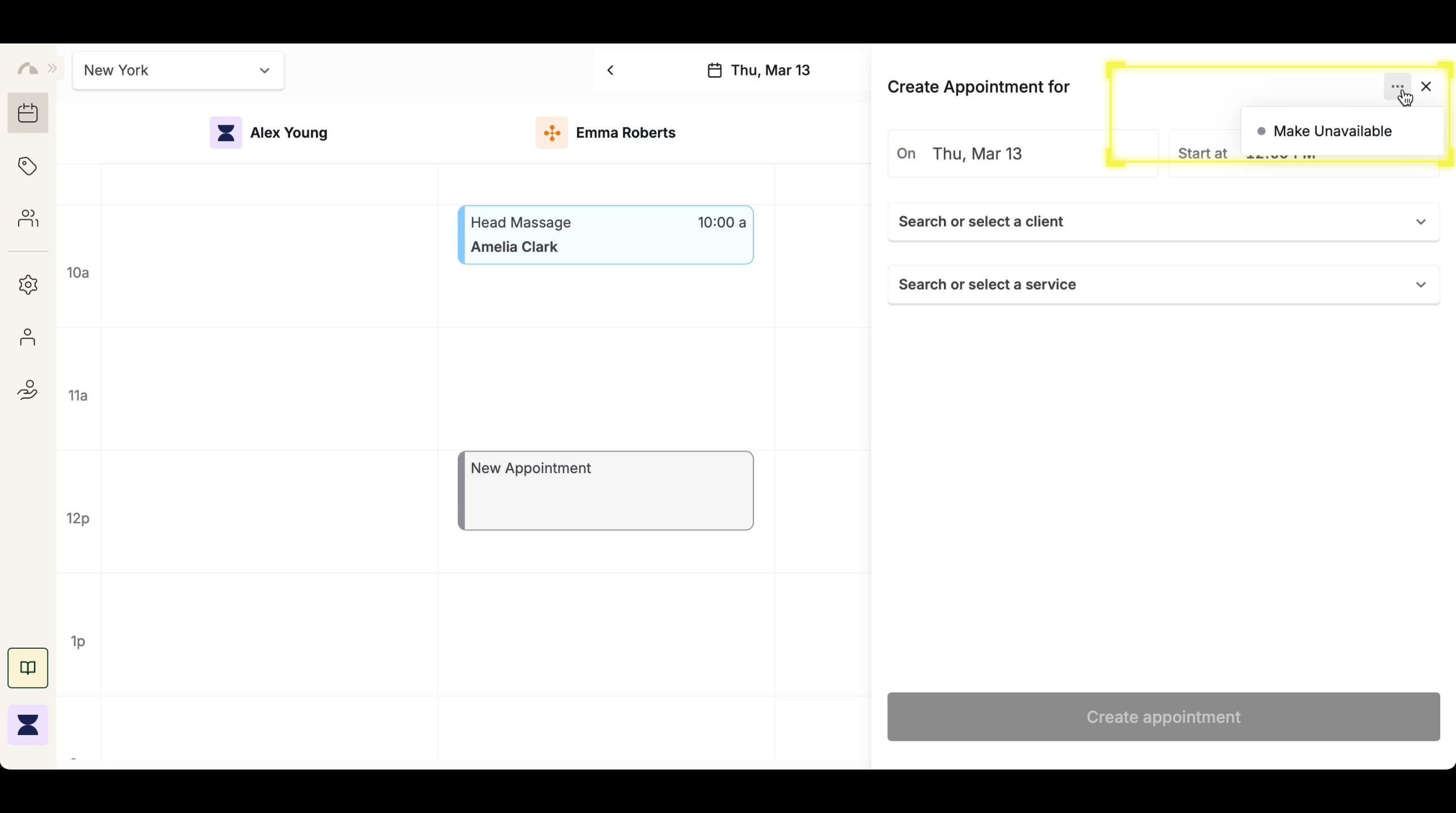 After selecting the time slot, click the 3-dot icon in the appointment window and select “Make Unavailable” from the menu. This action marks the selected time as blocked, preventing customers from booking during this period. The unavailability will now be displayed on the schedule as a blocked-off time slot.