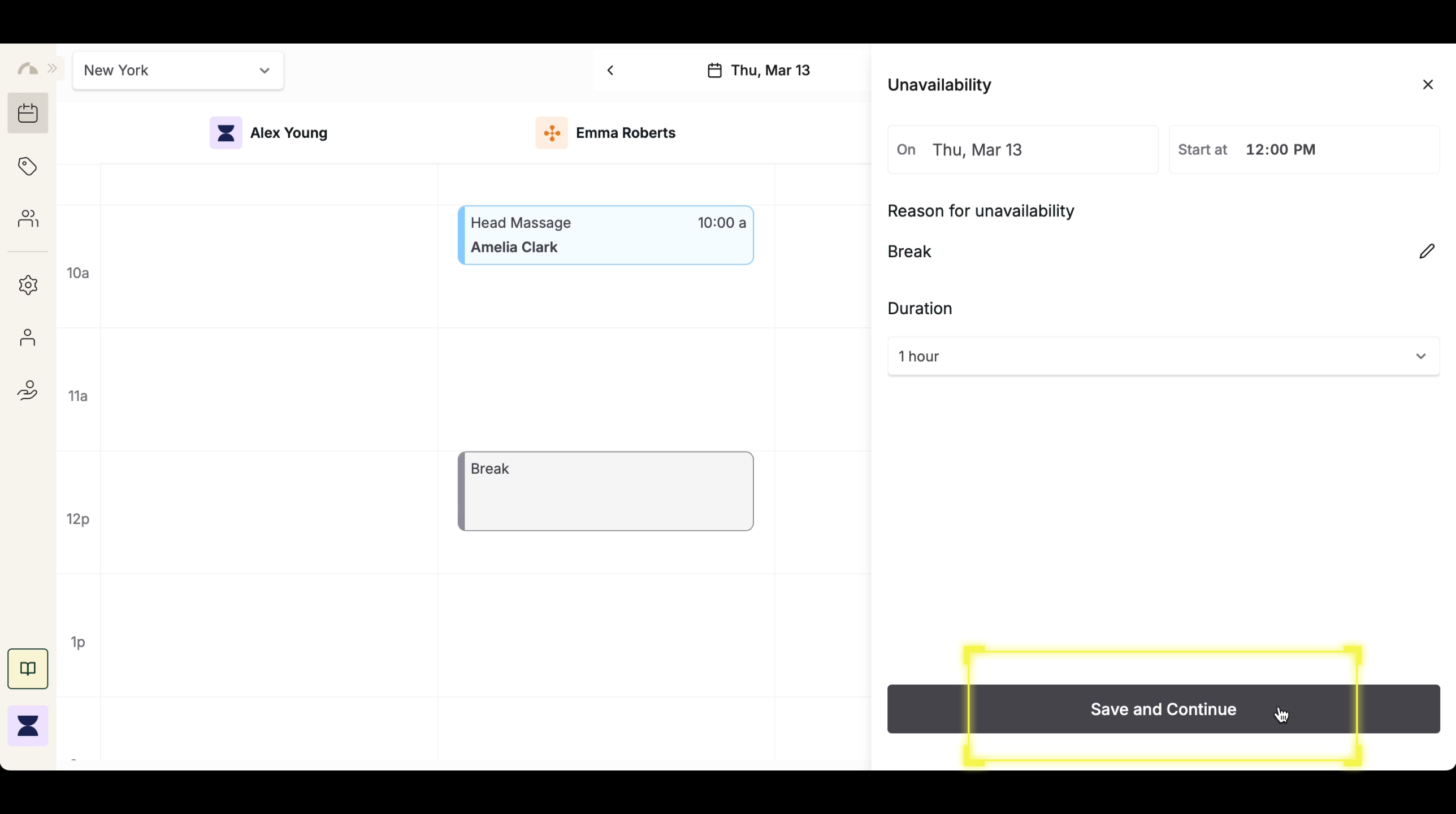 Double-check the break time details before saving. Once saved, the system will update the schedule, marking the selected time slot as unavailable. Staff members will now have a clearly defined break period, preventing appointments from being scheduled during that time.