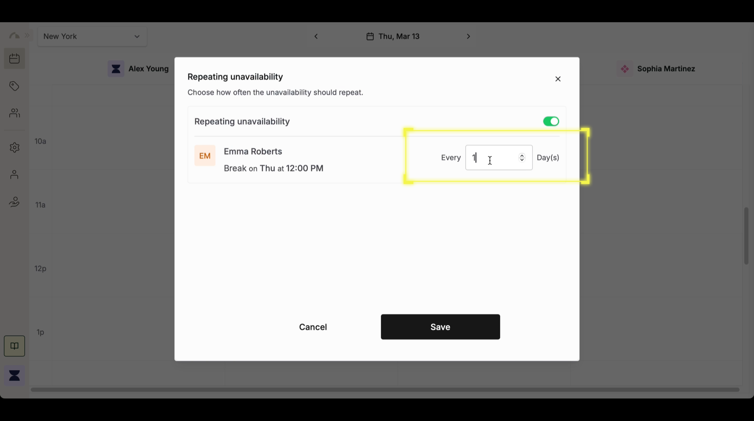 Set the unavailability to repeat daily and choose how often it should recur. You can enter a specific number, such as every 1 day for daily breaks, every 2 days for alternating breaks, or every 3 days for a flexible schedule. Adjusting the frequency ensures that break times match your staff’s needs while maintaining a structured calendar.