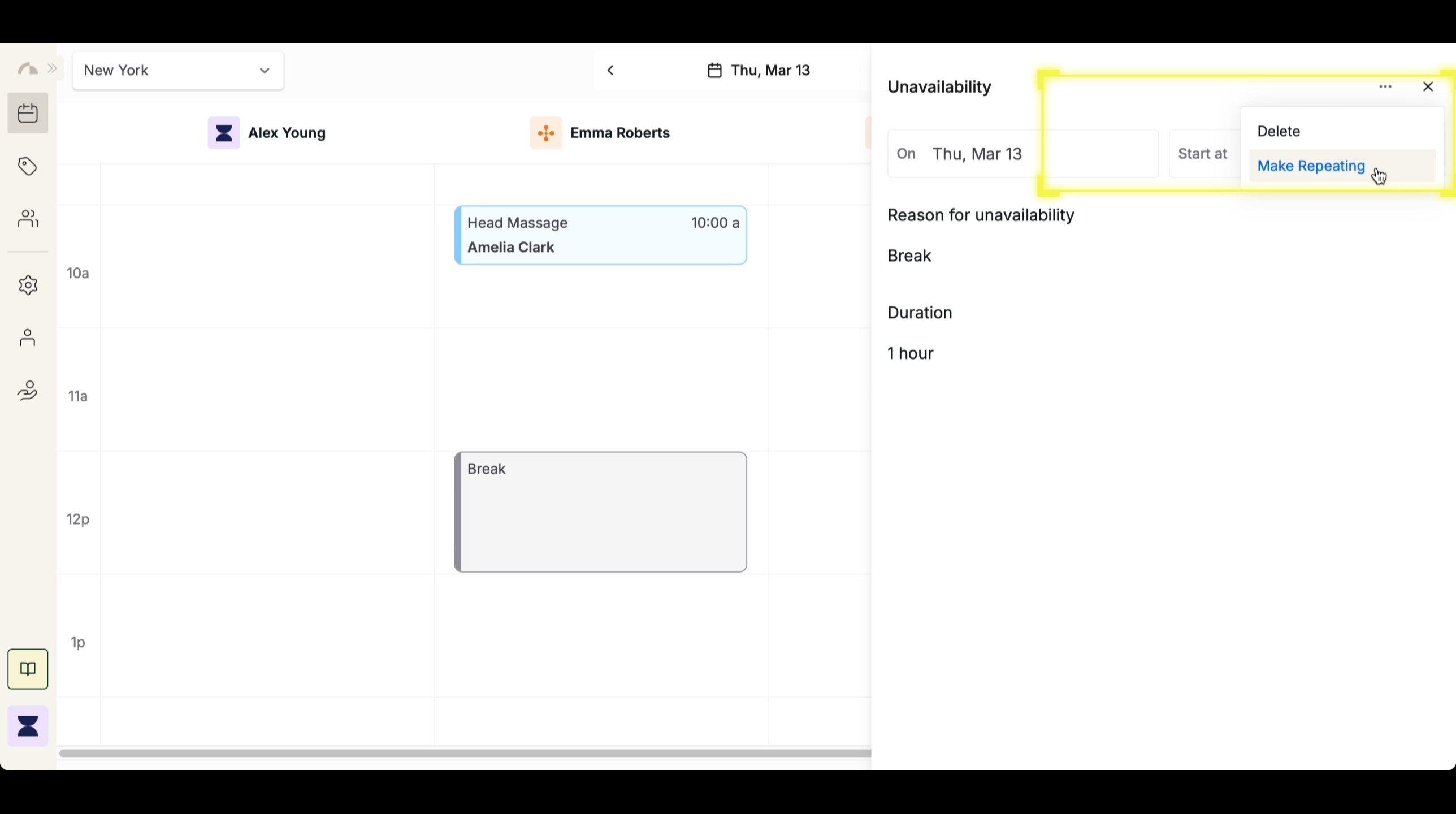 Click the 3-dot icon in the unavailability settings and select “Make Repeating” to turn this break time into a recurring event. Recurring breaks automate the process, ensuring the same time is blocked off without needing manual adjustments.