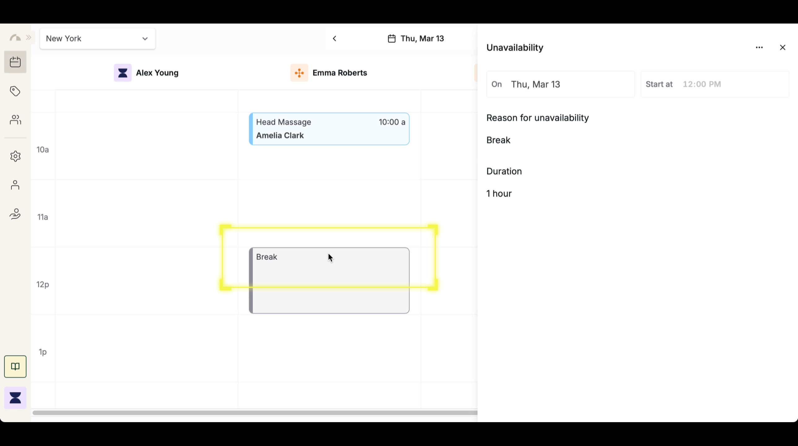 Locate the previously created break on the schedule. Click on the blocked-off time slot to open the unavailability settings and proceed with making it a recurring event. Ensuring the break is correctly selected prevents duplicate entries and keeps scheduling consistent.